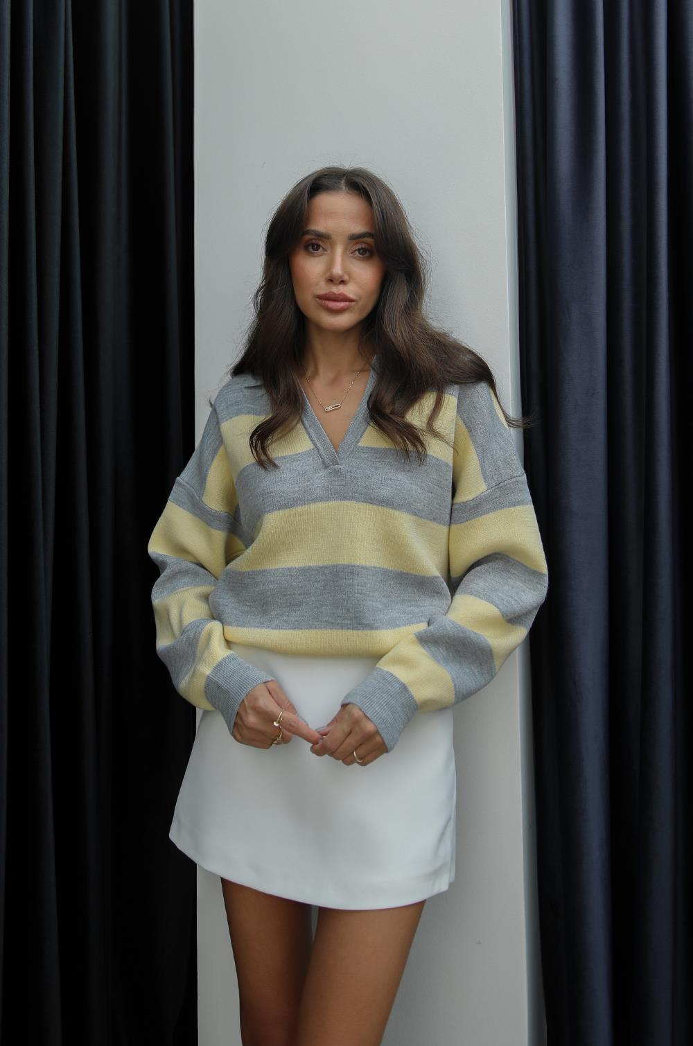 Gri Sarı Şeritli V Yaka Kazak (Hkaz636)