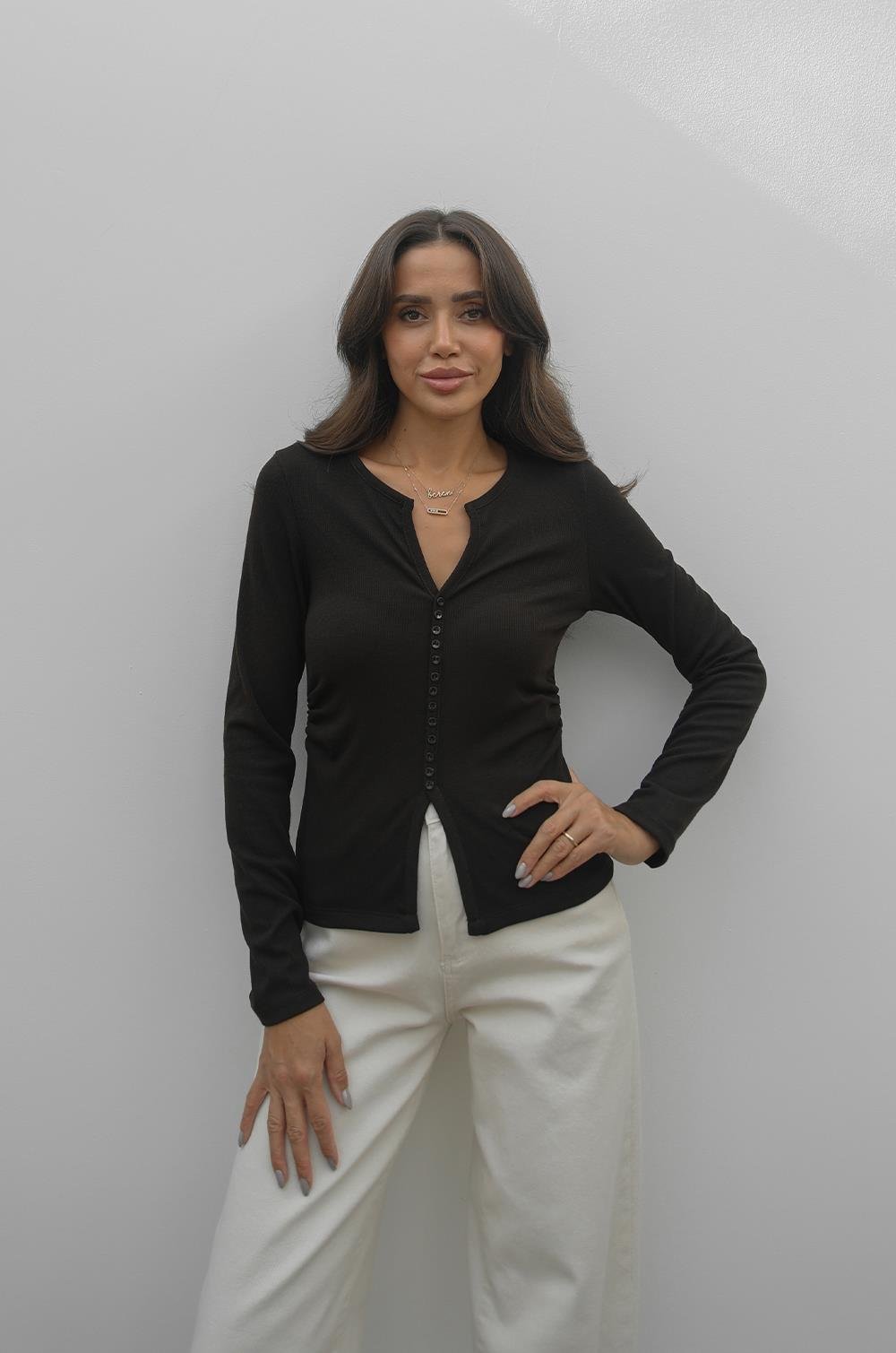 UZUN KOLLU, V KESİM, ÖNÜ DÜĞMELİ, YANLARI BÜZGÜLÜ, FİTİLLİ BLUZ