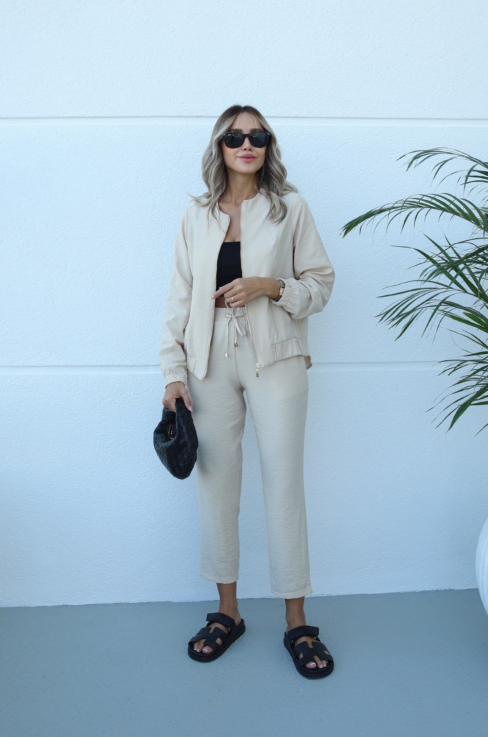 ÖNÜ FERMUARLI, BİSİKLET YAKA, KENARLARI LASTİKLİ, CEP DETAYLI CEKET