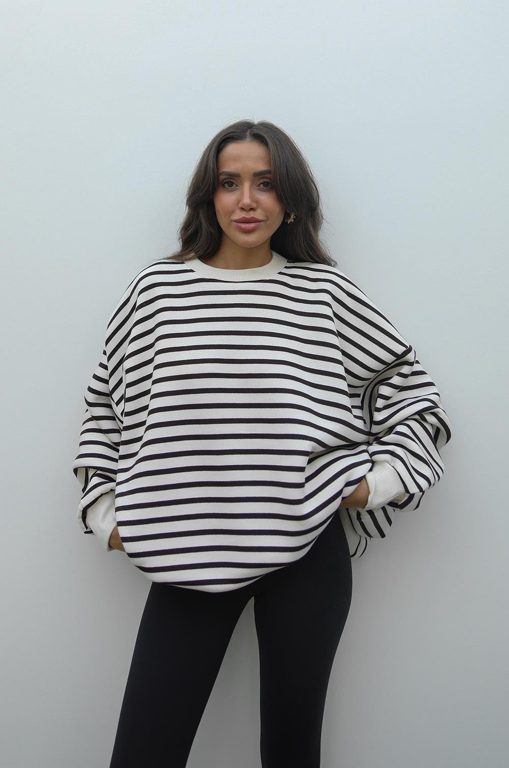 Kahve Çizgili Şardonlu Oversize Sweatshirt