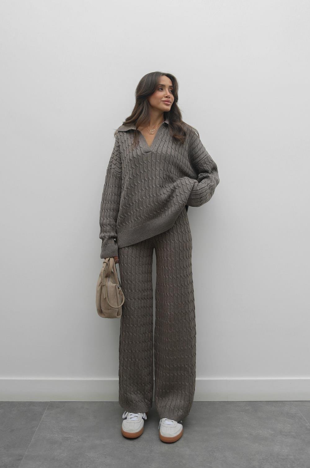 Kahverengi V Yaka Saç Örgü Triko Takım