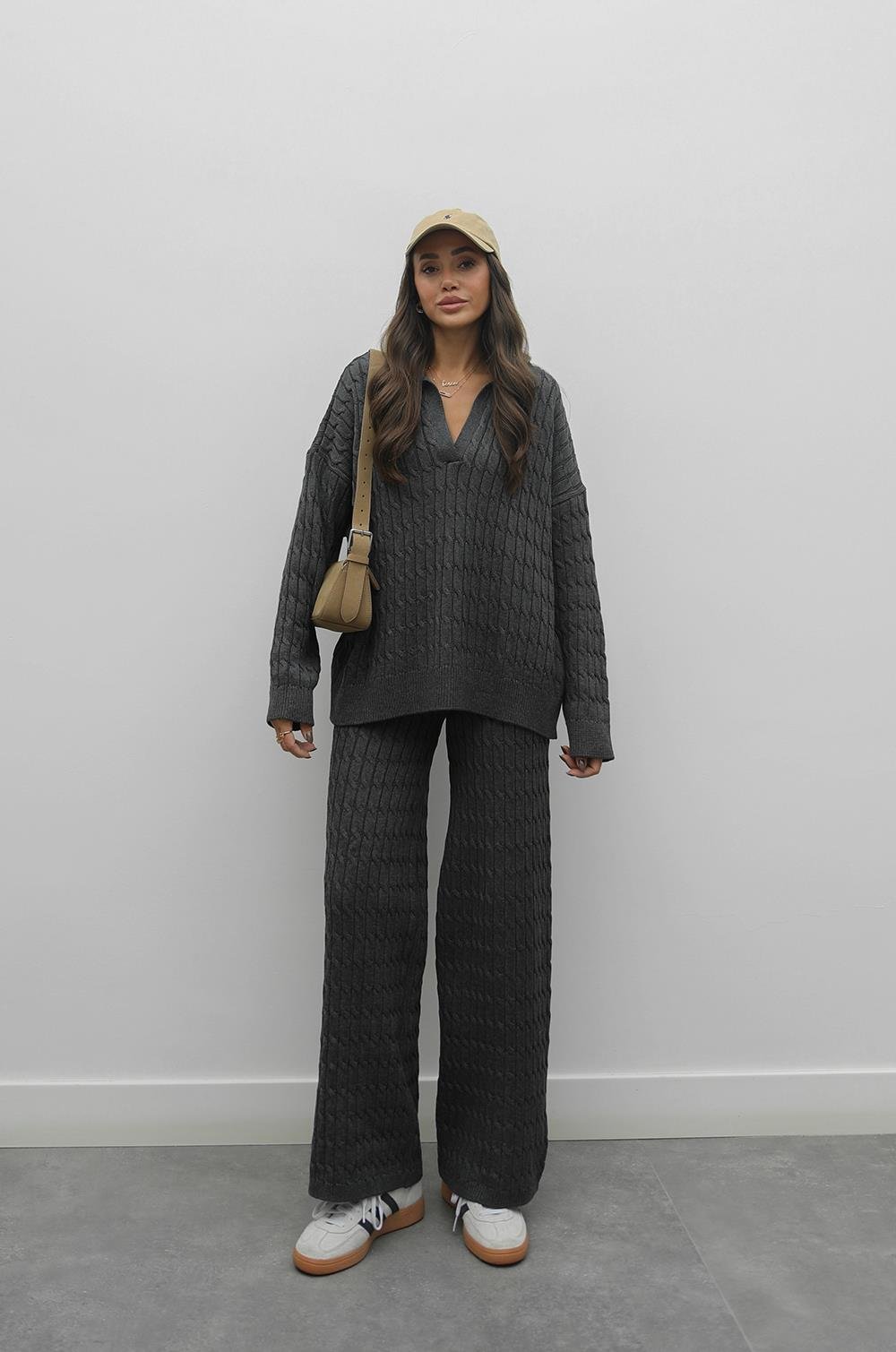 Bej V Yaka Saç Örgü Triko Takım Kahverengi V Yaka Saç Örgü Triko Takım