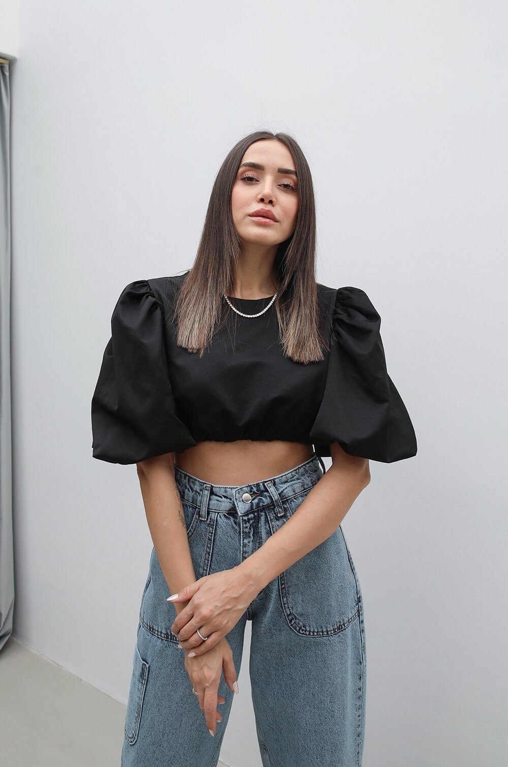 YARIM BALON KOLLU, BİSİKLET YAKA, KOLLARI VE ALTI LASTİKLİ, ARKASI DÜĞMEL, CROP BLUZ Model Ölçüleri : Boy : 170 cm Kilo : 48 kg