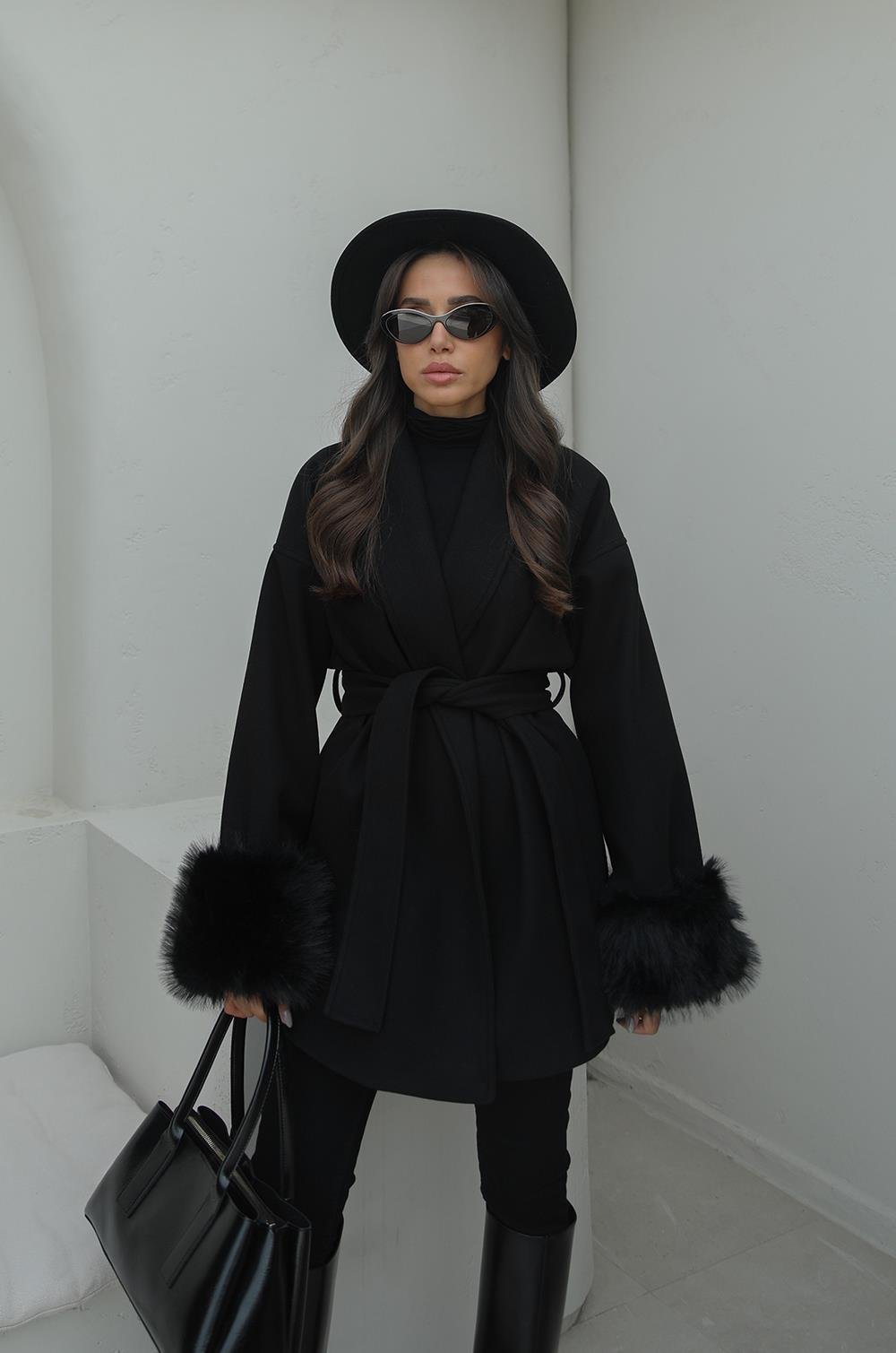 Siyah Kolları Kürklü Kuşaklı Kaşe Kaban (Hkab236)