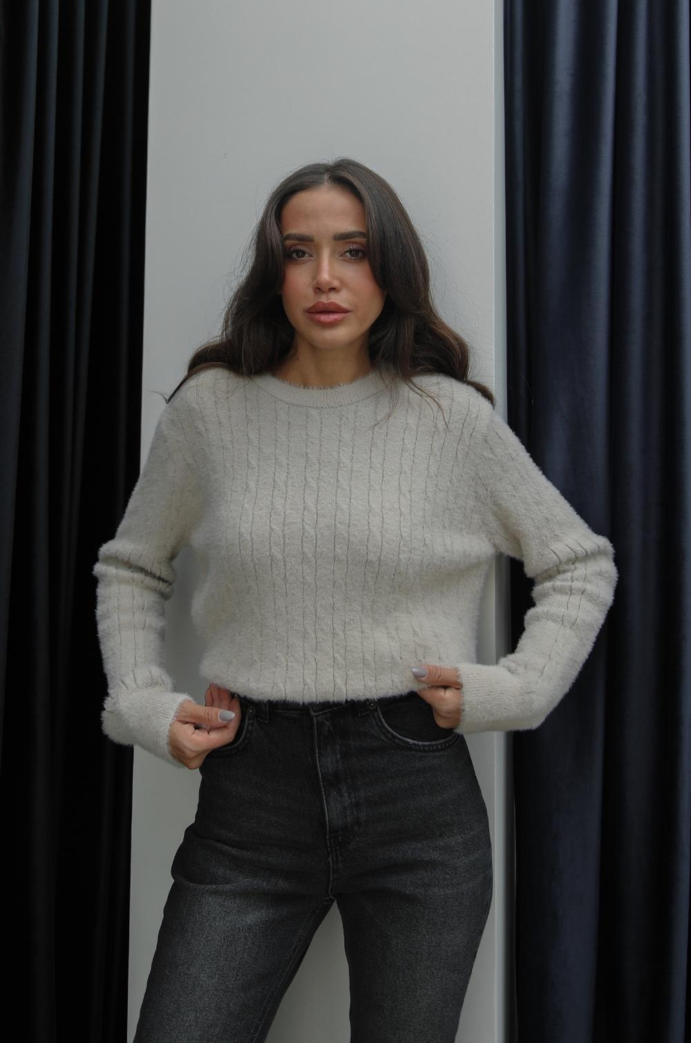 Siyah Yumoş Saç Örgü Detaylı Kazak Krem Yumoş Saç Örgü Detaylı Kazak