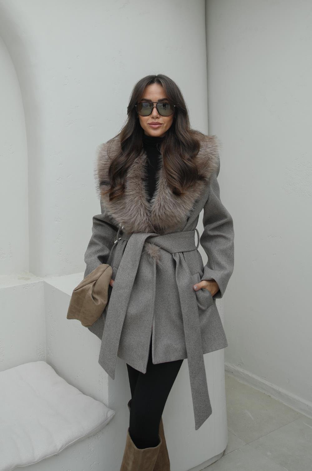 Siyah Opulent Yakası Kürklü Kuşaklı Kaban Gri Opulent Yakası Kürklü Kuşaklı Kaban